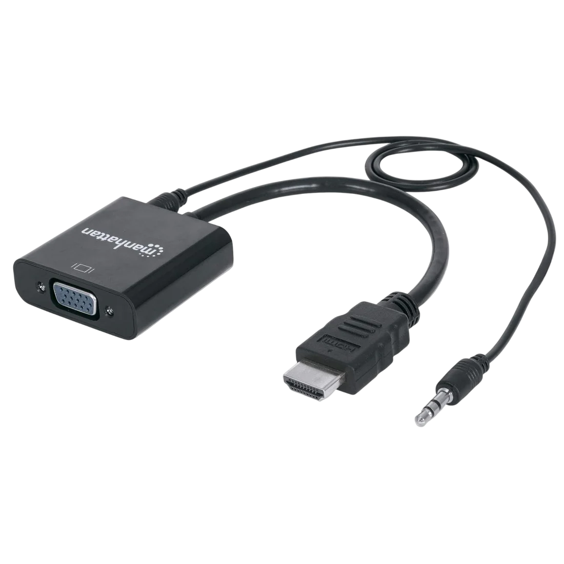 El Adaptador Manhattan 151559 es un convertidor activo de HDMI macho a VGA hembra, diseñado para conectar dispositivos modernos con salida HDMI (computadoras, consolas) a pantallas antiguas con entrada VGA (monitores, proyectores), ofreciendo una conversión de señal digital a analógica, con salida de audio (incluye cable 3.5mm) y soporta video HD 1080p, ideal para unir mundos tecnológicos distintos con calidad y blindaje contra interferencias.
