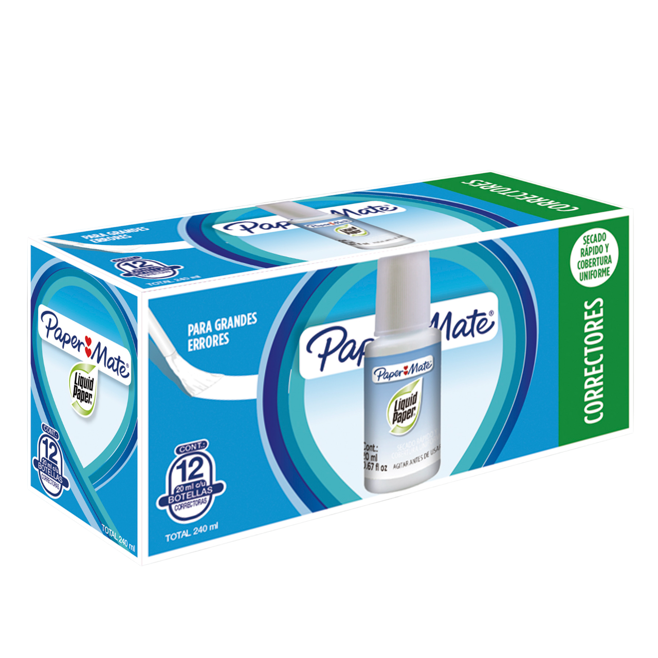 El corrector líquido Paper Mate (Liquid Paper) es un fluido blanco opaco, a base de agua, diseñado para cubrir errores de escritura, ya sea con tinta de pluma, roller o gel, ofreciendo una excelente cobertura y un secado rápido para reescribir sobre él. Se presenta en varios formatos, como tipo pluma (lápiz) con punta metálica para precisión o con aplicador de esponja/brocha, ideal para una aplicación controlada en documentos escolares y de oficina, dejando un acabado limpio y profesional.