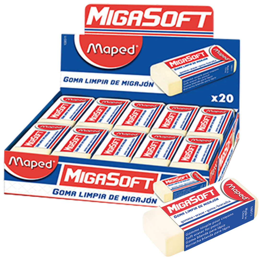 La goma Maped Migasoft Pocket (caja con 36 piezas) es un borrador tipo migajón de alta calidad, diseñado con una textura suave que elimina trazos de lápiz y grafito sin dañar, romper o manchar el papel. Ideal para uso escolar y profesional, su tamaño compacto (“pocket”) facilita su transporte en estuches.