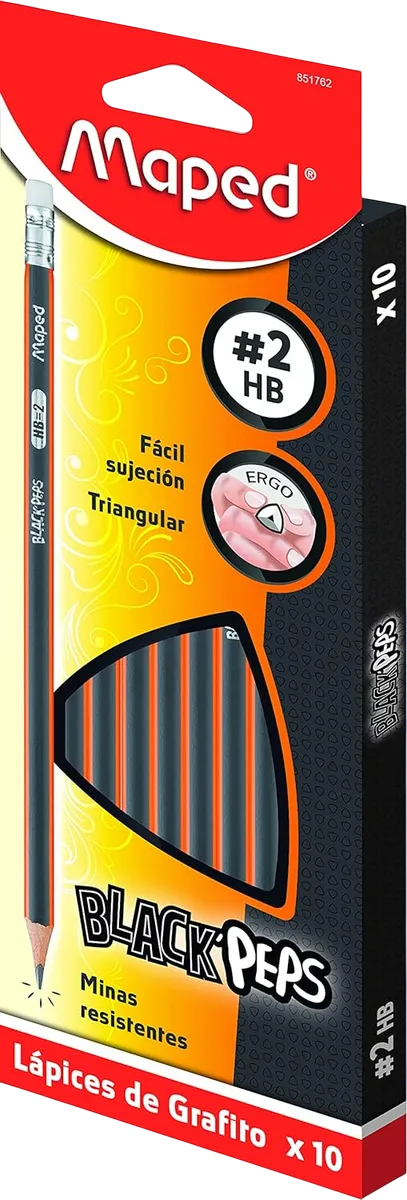 Los lápices Maped Black’Peps Triangulares #2 (HB) son herramientas de escritura ergonómicas diseñadas para facilitar la sujeción, siendo ideales para el aprendizaje de niños (entrenador) y para uso escolar o de oficina. Esta presentación suele incluir 10 piezas, con características que promueven un trazo cómodo y sin fatiga.