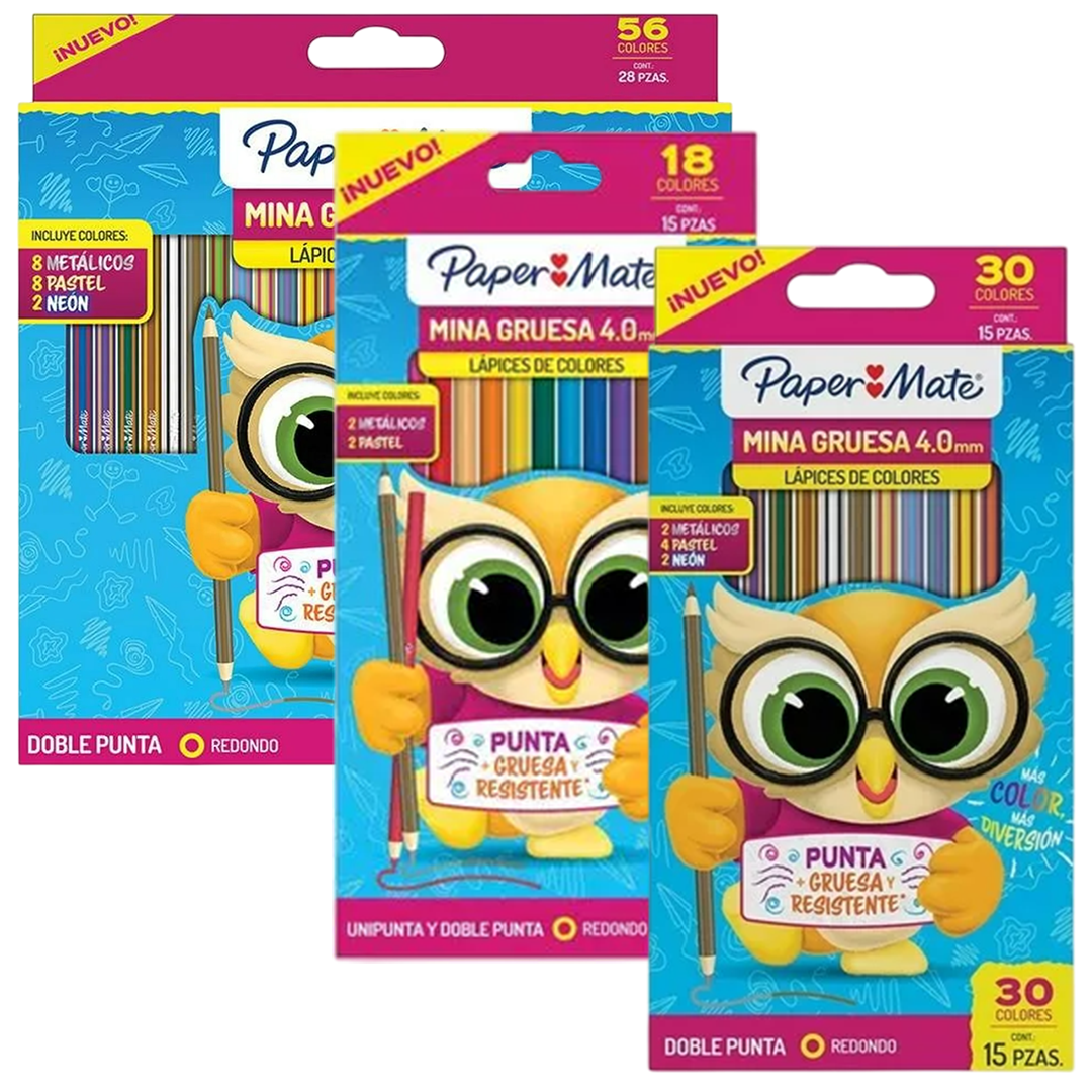 Los lápices de color Paper Mate de 4mm largos destacan por su mina gruesa y resistente, ideal para colorear áreas grandes y trazos intensos. Disponibles en presentaciones largas (redondas o triangulares), ofrecen colores vibrantes y un diseño ergonómico para mayor comodidad, siendo perfectos para uso escolar y artístico.