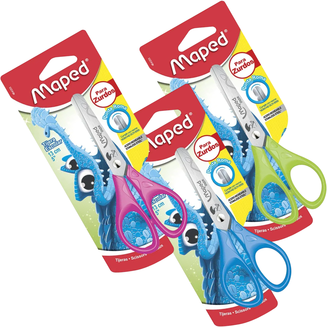 La tijera escolar Maped Essentials para zurdos (13 cm / 5″) presenta cuchillas de acero inoxidable invertidas para una visibilidad de corte precisa y mangos ergonómicos de plástico. Su punta roma (redondeada) garantiza seguridad en actividades escolares. Diseñada para niños, ofrece comodidad y resistencia en el uso diario, siendo ideal para papel y cartulina.