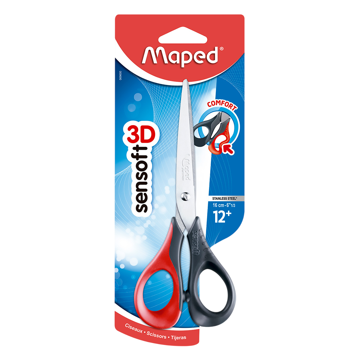 La tijera escolar Maped Sensoft de 16 cm (6 1/3 pulgadas) destaca por sus aros ergonómicos 3D, suaves y flexibles, que brindan máxima comodidad al cortar. Cuentan con cuchillas de acero inoxidable duradero para cortes precisos, ideales para uso escolar y oficina, disponibles en varios colores.