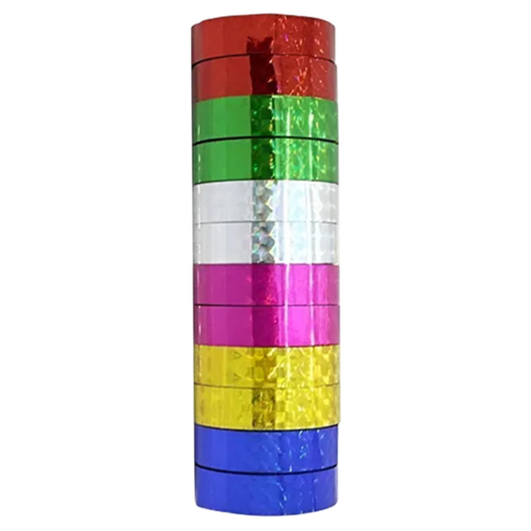 Cinta adhesiva transparente con un acabado brillante y reflectante que cambia de color, ideal para decoración y manualidades, no para uso médico; se adhiere a superficies como papel, plástico, madera y vidrio, añadiendo un toque festivo, y existen versiones para sellado de cajas y hasta para ahuyentar aves por su efecto visual.