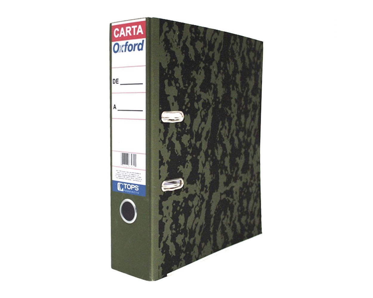 Registrador Oxford, tamaño carta, color verde marmoleado, mecanismo metálico.