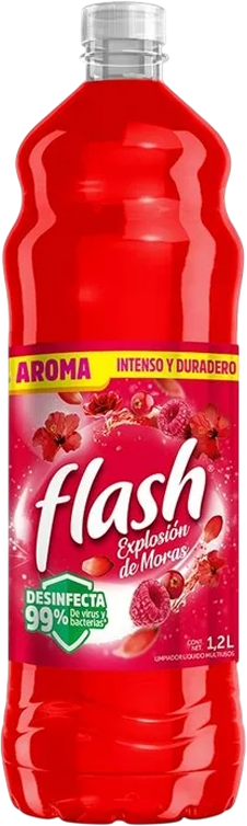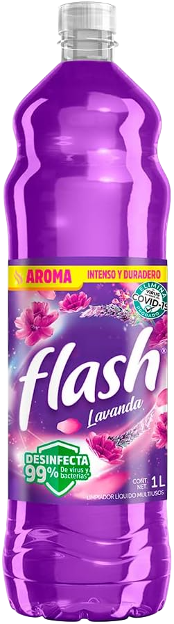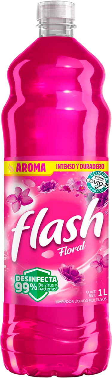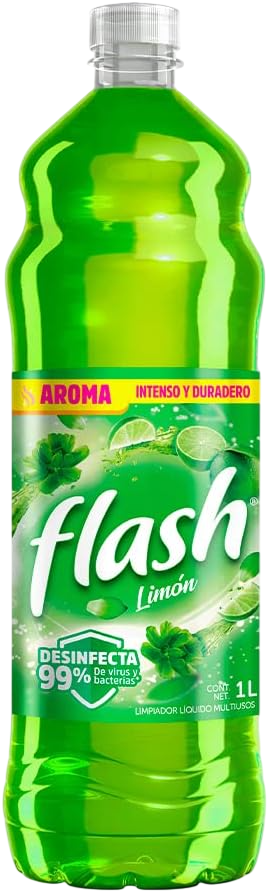 El limpiador líquido multiusos Flash (1 litro) es una solución desinfectante que elimina el 99.9% de virus y bacterias, incluyendo el causante del COVID-19. Ideal para diversas superficies como pisos, cocinas y baños, ofrece aromas intensos y duraderos sin cloro, además de contar con una fórmula biodegradable.